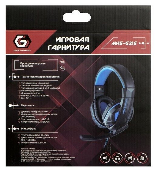 Гарнитура игровая Gembird Mhs-g215, код ""Printbar"", черный/синий, регулировка громкости, кабель 2м .
