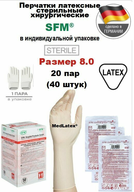 Купить Перчатки латексные стерильные хирургические SFM, цвет: бежевый, размер 8.0, 40 шт. (20 пар), с валиком, неопудренные