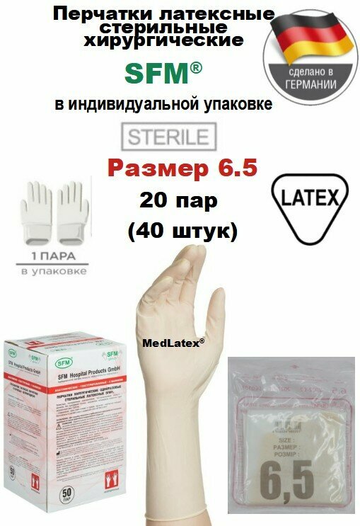 Купить Перчатки латексные стерильные хирургические SFM, цвет: бежевый, размер 6.5, 40 шт. (20 пар), с валиком, неопудренные