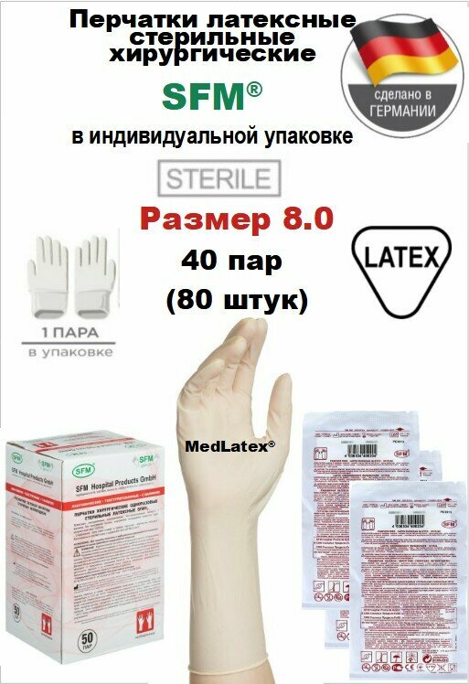 Перчатки латексные стерильные хирургические SFM, цвет: бежевый, размер 8.0, 40 шт. (20 пар), с валиком, неопудренные