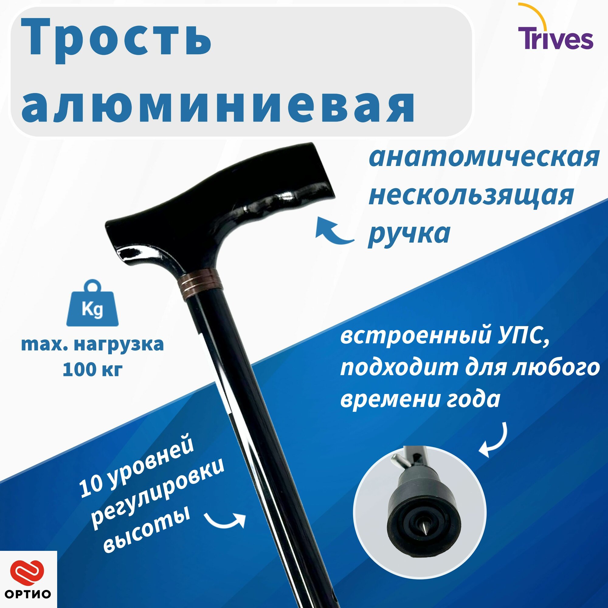 Трость телескопическая Trives с анатомической Т-образной ручкой и УПС,цвет черный
