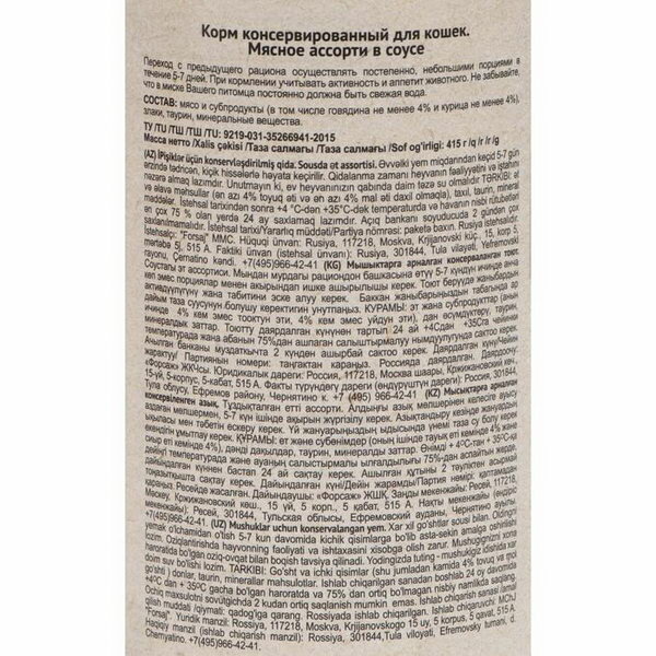 Влажный корм Chammy для кошек, мясное ассорти в соусе, ж/б, 415 г интересное: