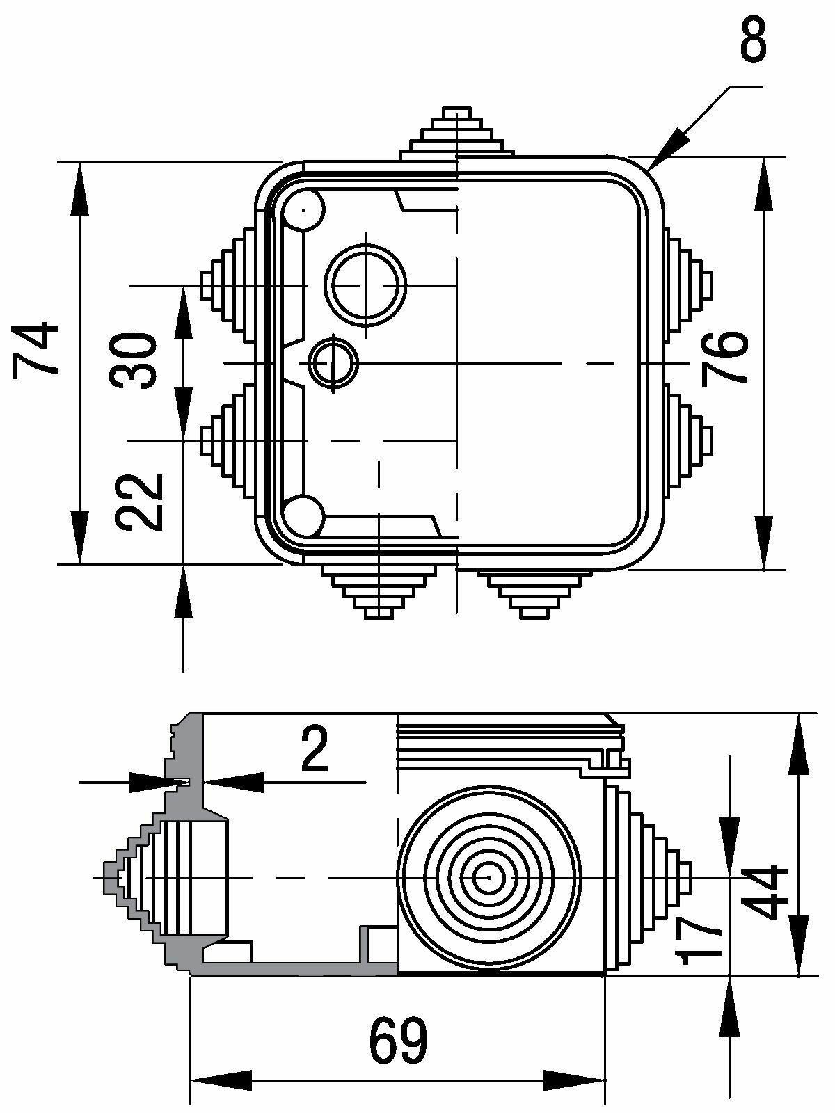 Рувинил 67030 Тусо.Коробка расп. для о/п, 70х70х40мм, 7вводов, IP55 (св.-серая)