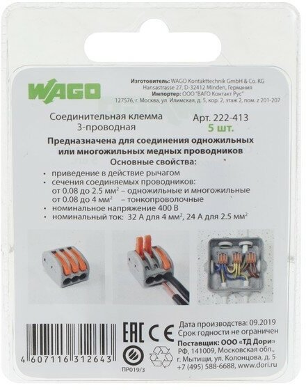 Клемма WAGO с рычагами 3-проводная 222-413, 10 шт.