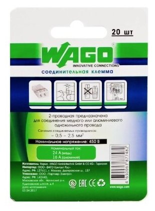 Клемма соединительная Wago 2273-242 2-х проводная с пастой 0.5-2.5 мм 20 шт.