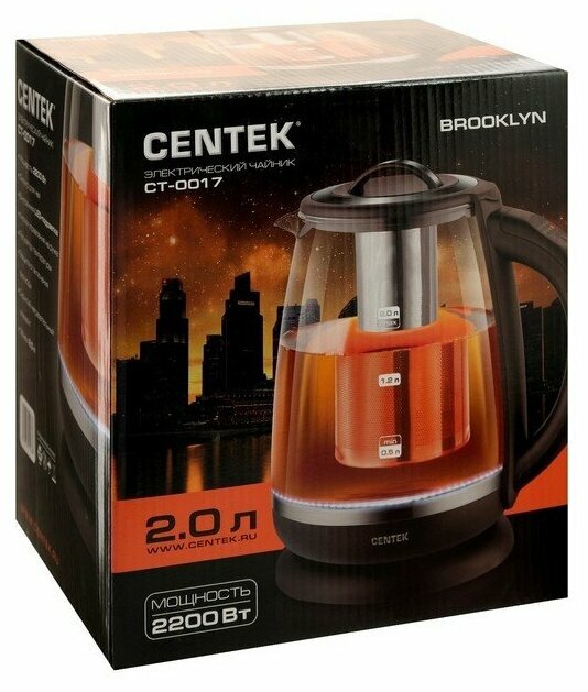 Чайник электрический Centek CT-0017 Brooklyn, стекло, 2 л, 2200 Вт, чёрный Centek 4774930 .