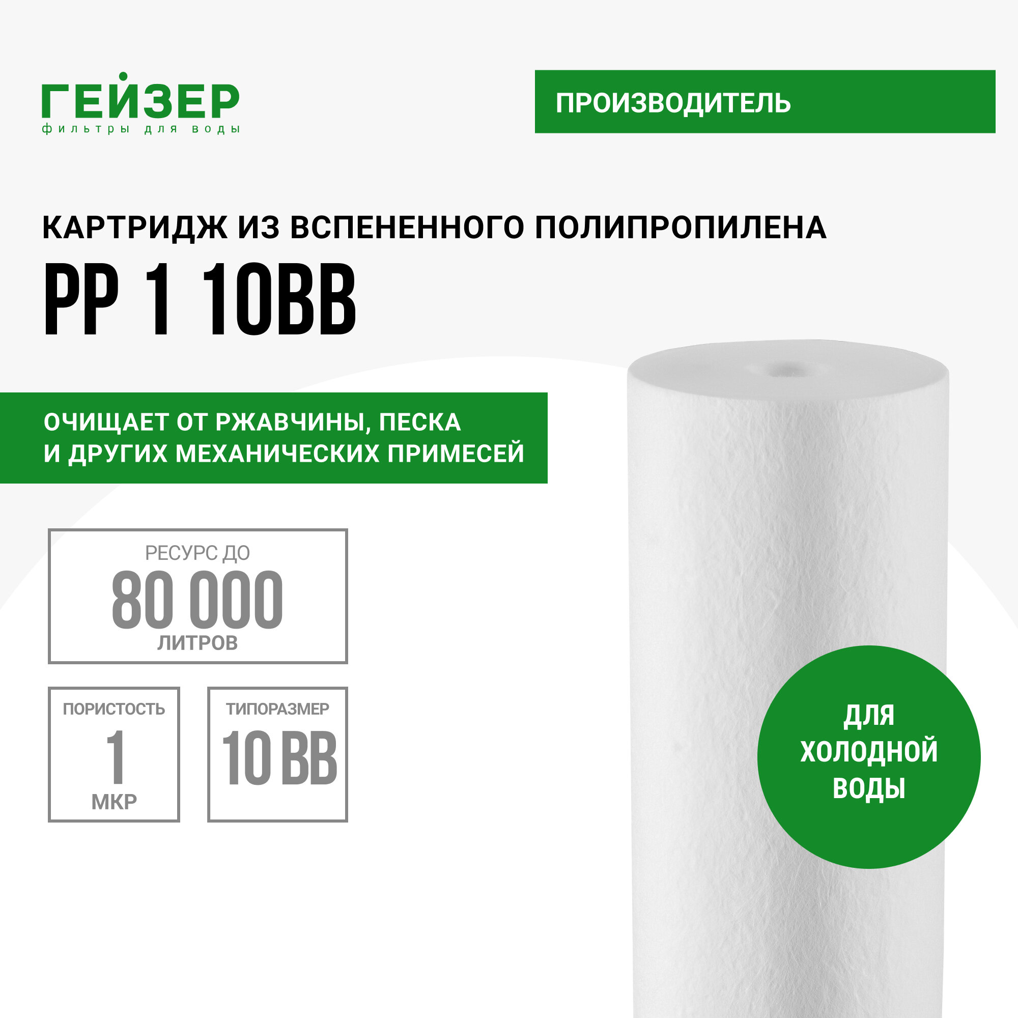 Картридж Гейзер PP 1-10BB, 1мкм, полипропилен для холодной воды, Арт.28073