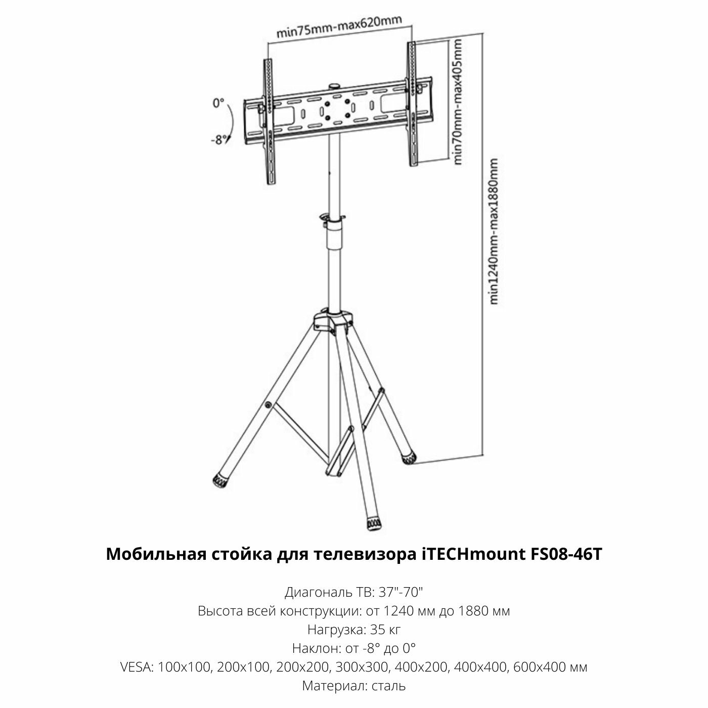 Стойка-тренога с изменяемой высотой для телевизора или монитора с диагональю от 37 до 70 дюймов iTECHmount FS08-46T