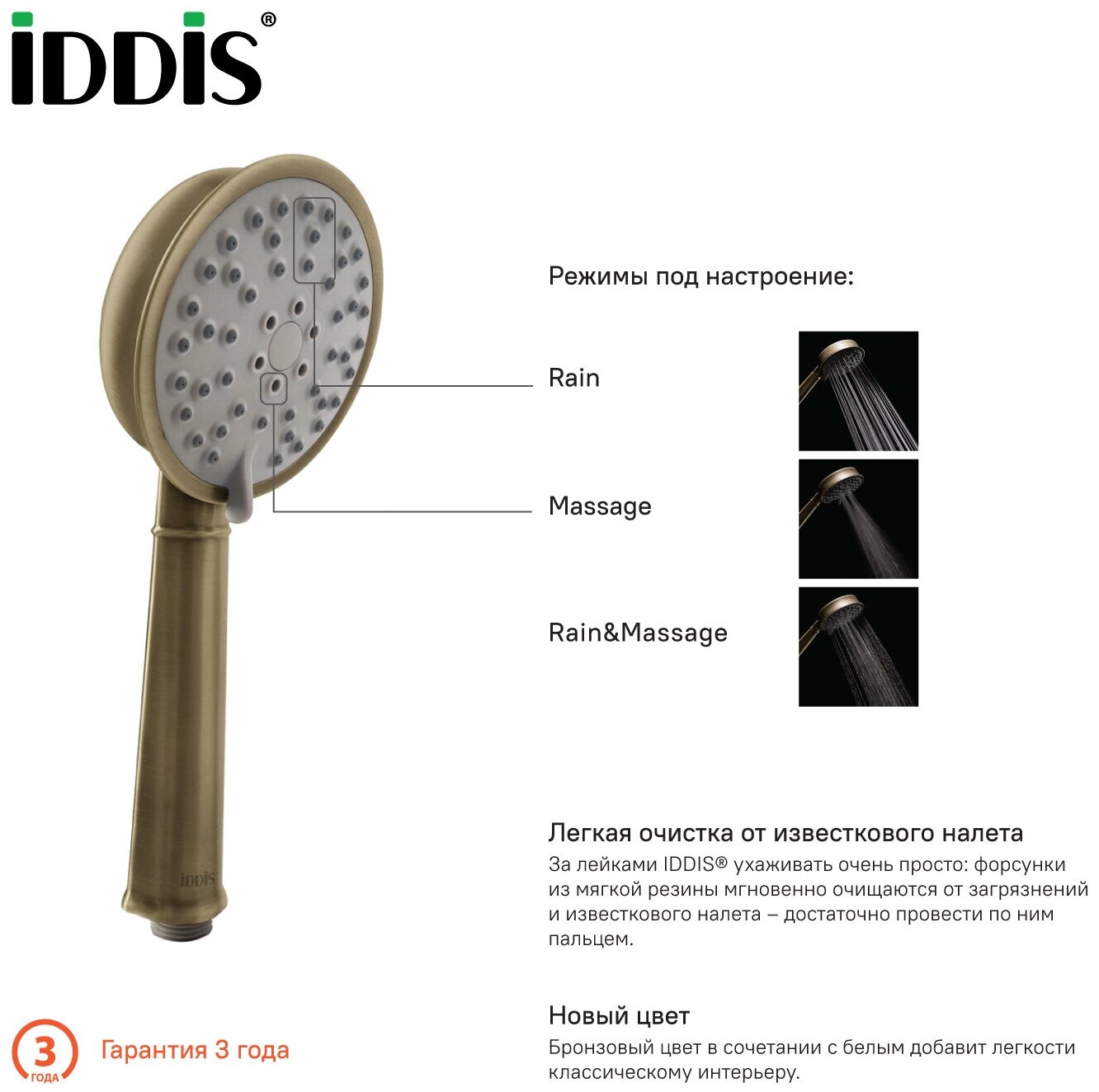 Лейка для душа IDDIS 102 мм, 3 режима, бронза OLD3F02i18