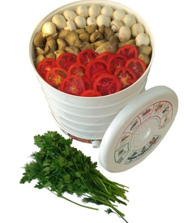 Ничего лишнего и все функционально. Качество пластика хорошее. Фрукты, овощи, мясо - сушит. |