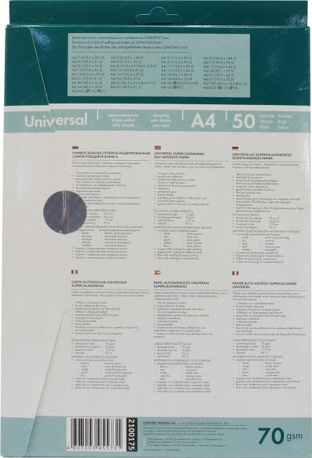 Бумага A4 Lomond Самоклеящаяся универсальная 24 деления (64x33,4) 70г/м2 50л (2100175) .