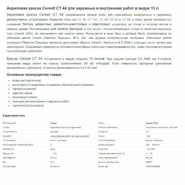 Краска водно-дисперсионная фасадная Ceresit СТ 44 15 л интересное:
