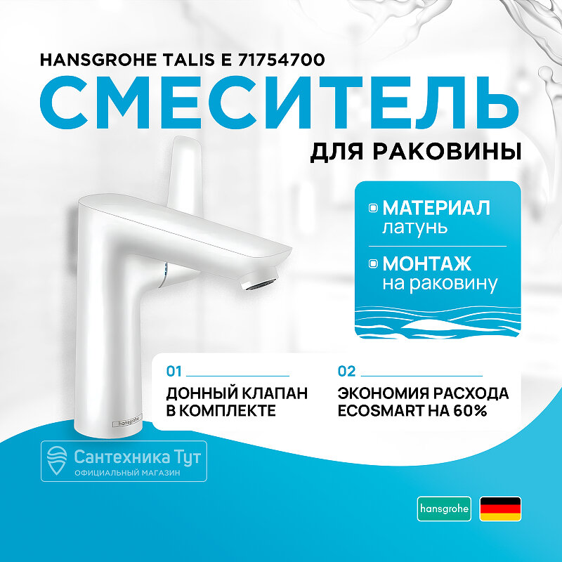 Talis E, смеситель для умывальника, неповоротный излив, белый цвет, с донным клапаном, матовый, рычаг справа, арт. 71754700, Hansgrohe