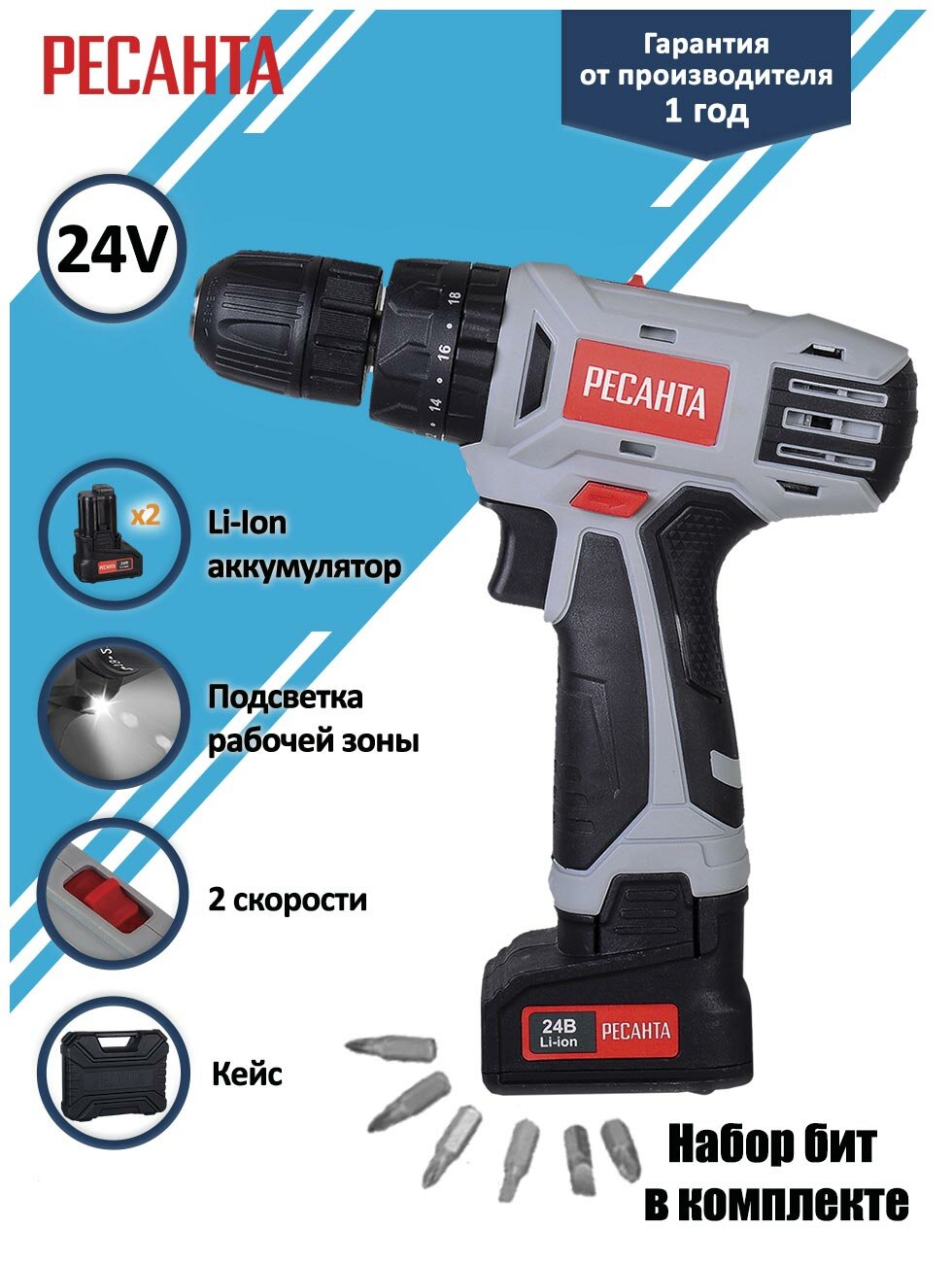 Дрель-шуруповерт РЕСАНТА ДА-24-2ЛК, 2Ач, с двумя аккумуляторами [75/14/7]