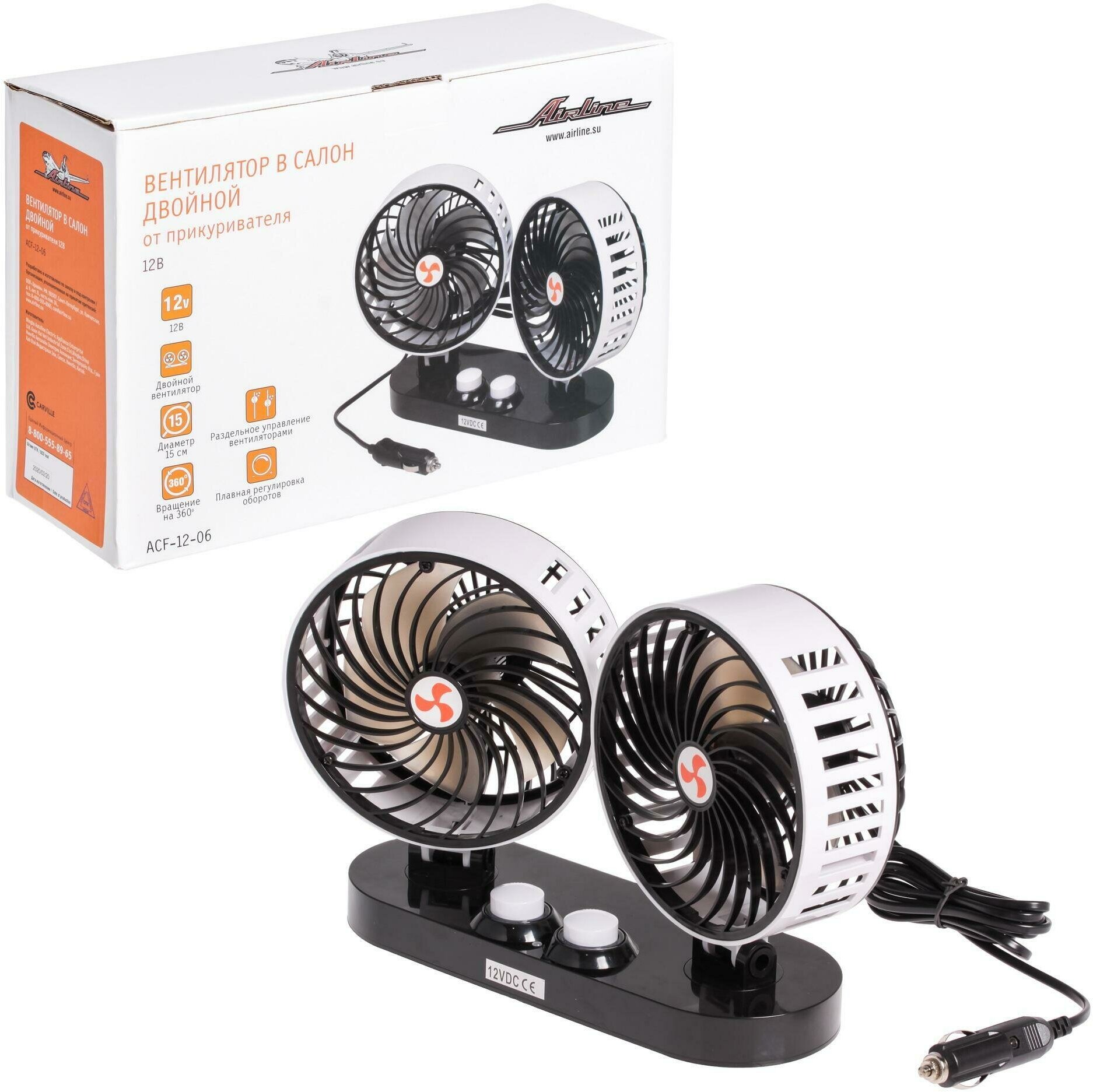 AIRLINE ACF-12-06 Вентилятор в салон двойной 2х15см 12В раздельная регулировка пластик (ACF-12-06)