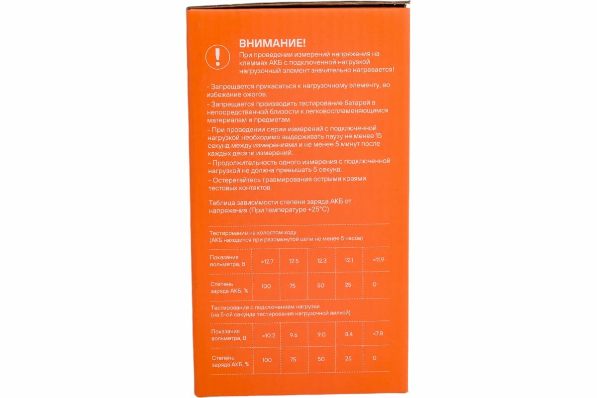 | Дополнительная информация | номинальное напряжение АКБ: 12В, максимальная ёмкость тестируемой АКБ 190Ач, время измерения под нагрузкой не более 5 сек |