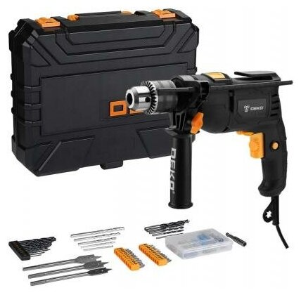 Ударная дрель DEKO DKID600W кейс + набор инструментов 92 предмета, 600 Вт черный/оранжевый