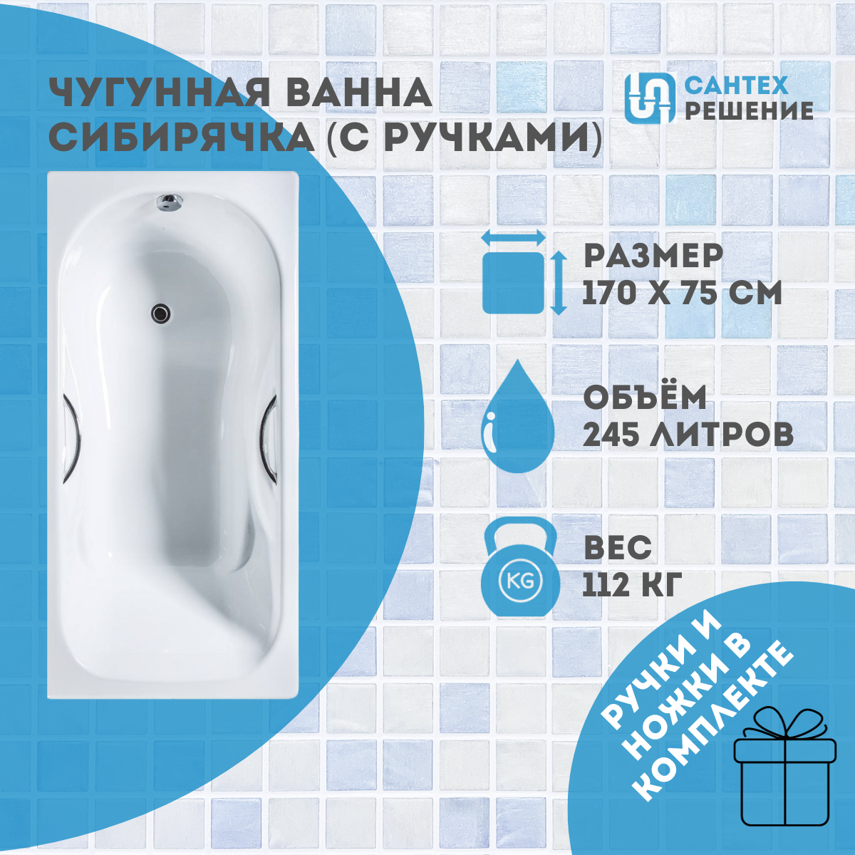 Чугунная ванна Универсал Сибирячка 170x75 см белая, глянцевая, с ножками и ручками