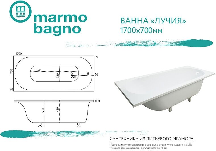 Ванна Marmo Bagno Лучия 170x70 с ножками без гидромассажа, иск. камень интересное: