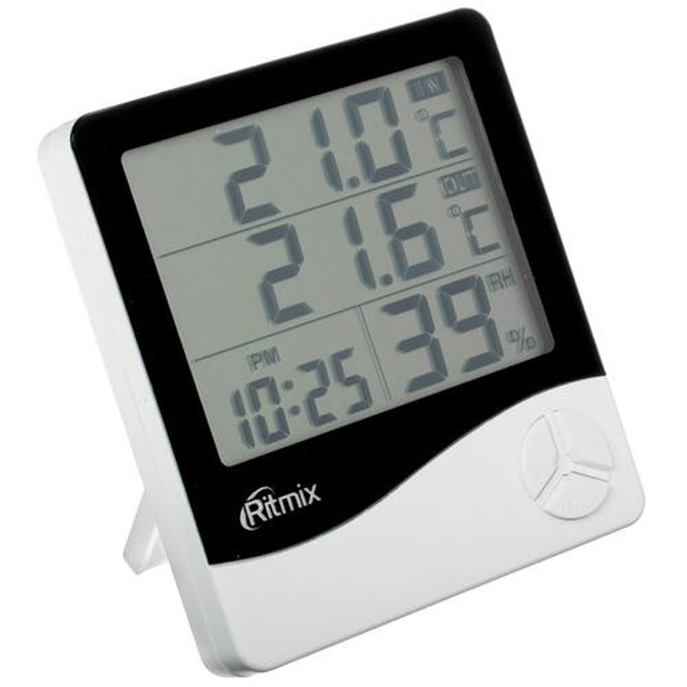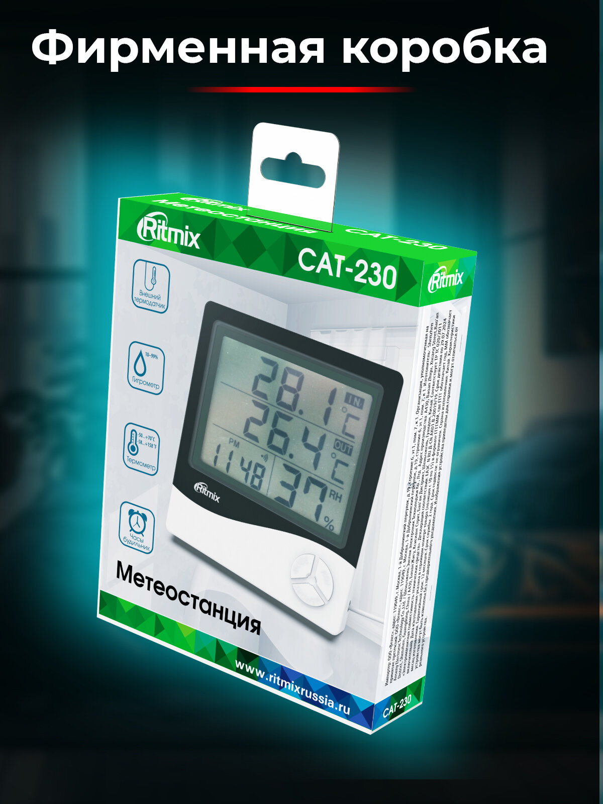 Метеостанция RITMIX CAT-230 черный/белый, дисплей LCD, термометр комнатный и уличный, диапазон показателей температуры -50°C ..+70°C (-58°F..+158°F), гигрометр комнатный, диапазон показателей влажности 10% ..99%, электронные часы, будильник, календарь, пи