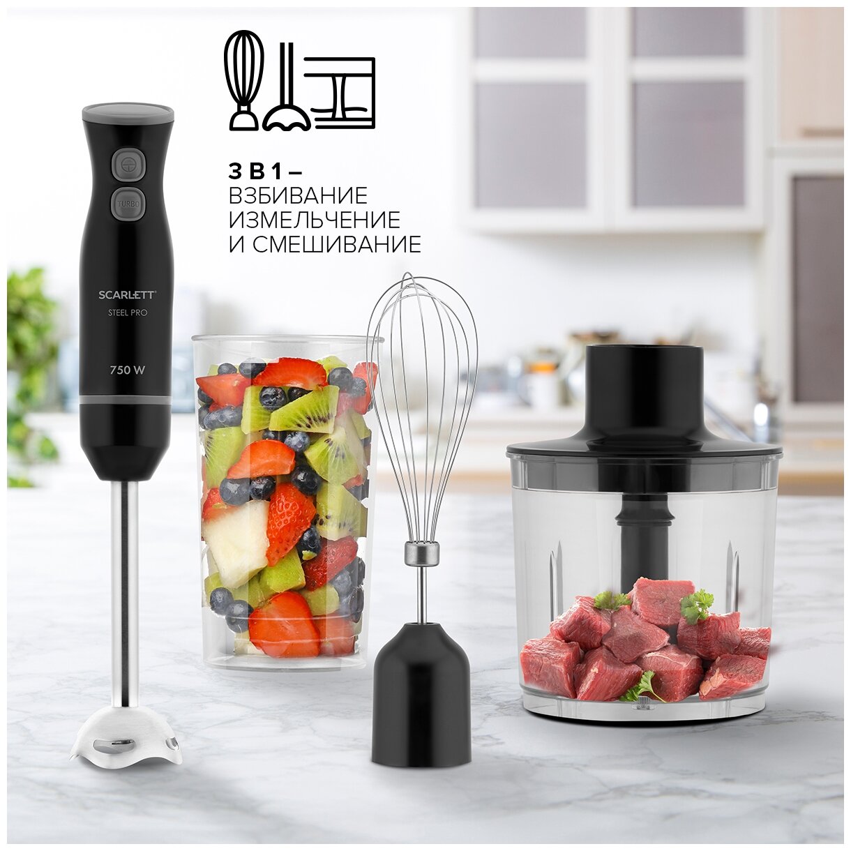 Погружной блендер Scarlett SC-HB42F62, черный, 750 Вт, 3 насадки, 2 скорости, измельчитель
