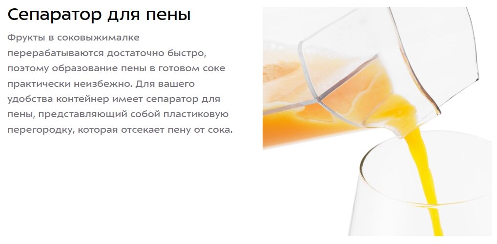 Легко отжимает сок как из мягких овощей и фруктов, так и из твердых (пробовал на морковке). Жмых после процесса остается сухим. Симпатичный дизайн. Собирается и разбирается без проблем. В комплекте имеется удобный сепаратор для пены. |