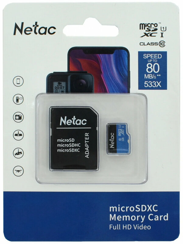 Карта памяти Netac microSD 64 ГБ Class 10, V10, A1, UHS Class 1, R 80 МБ/с, 1 шт., черный/синий