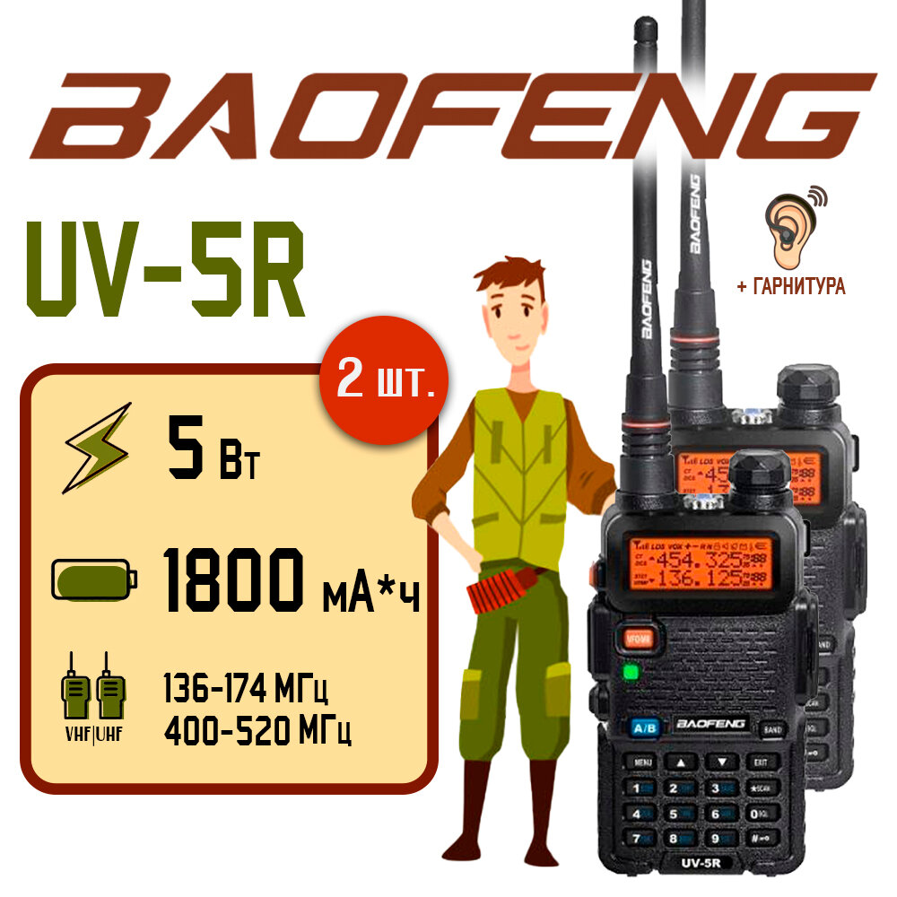 Рация Baofeng UV-5R 5Вт с гарнитурой, комплект 2 штуки, 1800 мА*ч , радиус 10 км