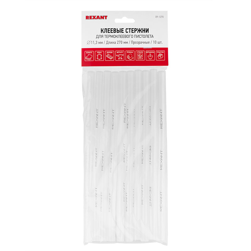 Купить Rexant Клеевые стержни, 11 мм, 270 мм, прозрачные, 10 шт., хедер 09-1270