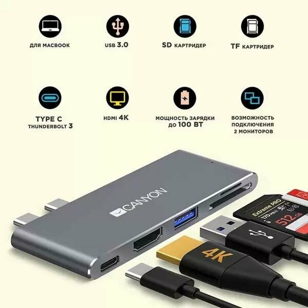 Ниже Вы можете прочитать отзывы на Хаб (разветвитель) Canyon DS-5 5 портов (Thunderbolt 3, USB 3.0, HDMI, SD, TF), ознакомится с подробными характеристиками, посмотреть интересные обзоры и фотографии на Хаб (разветвитель) Canyon DS-5 5 портов (Thunderbolt 3, USB 3.0, HDMI, SD, TF).