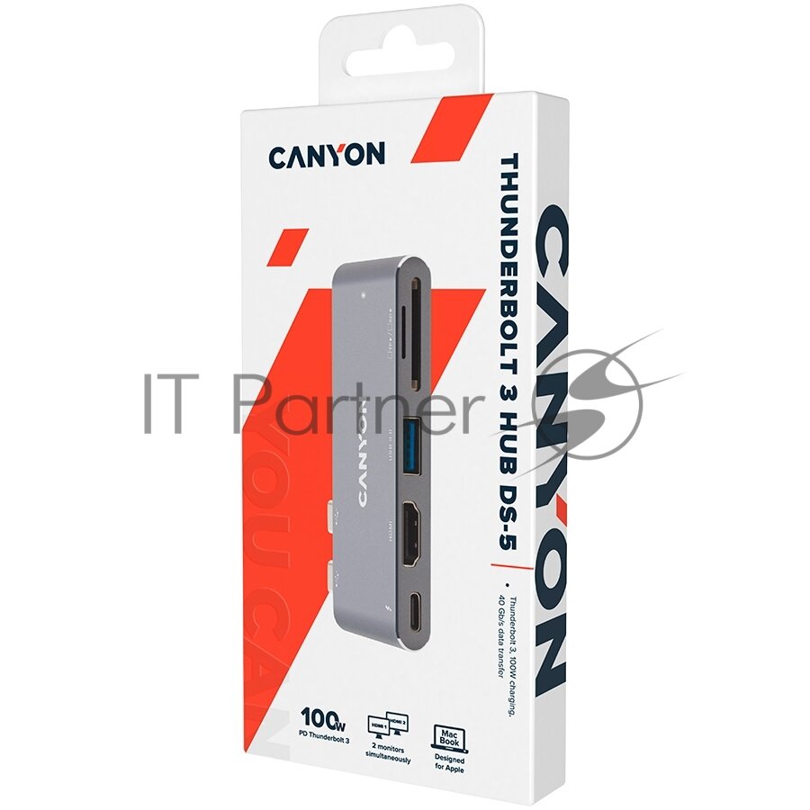 CANYON DS-5 Multiport Docking Station with 5 port, with Thunderbolt 3 Dual type C male port, 1*Thunderbolt 3 female+1*HDMI+1*USB3.0+1*SD+1*TF. Input 100-240V, Output USB-C PD100W&USB-A 5V/1A, Aluminium alloy, Space gray, 90*41*11mm, 0.04kg