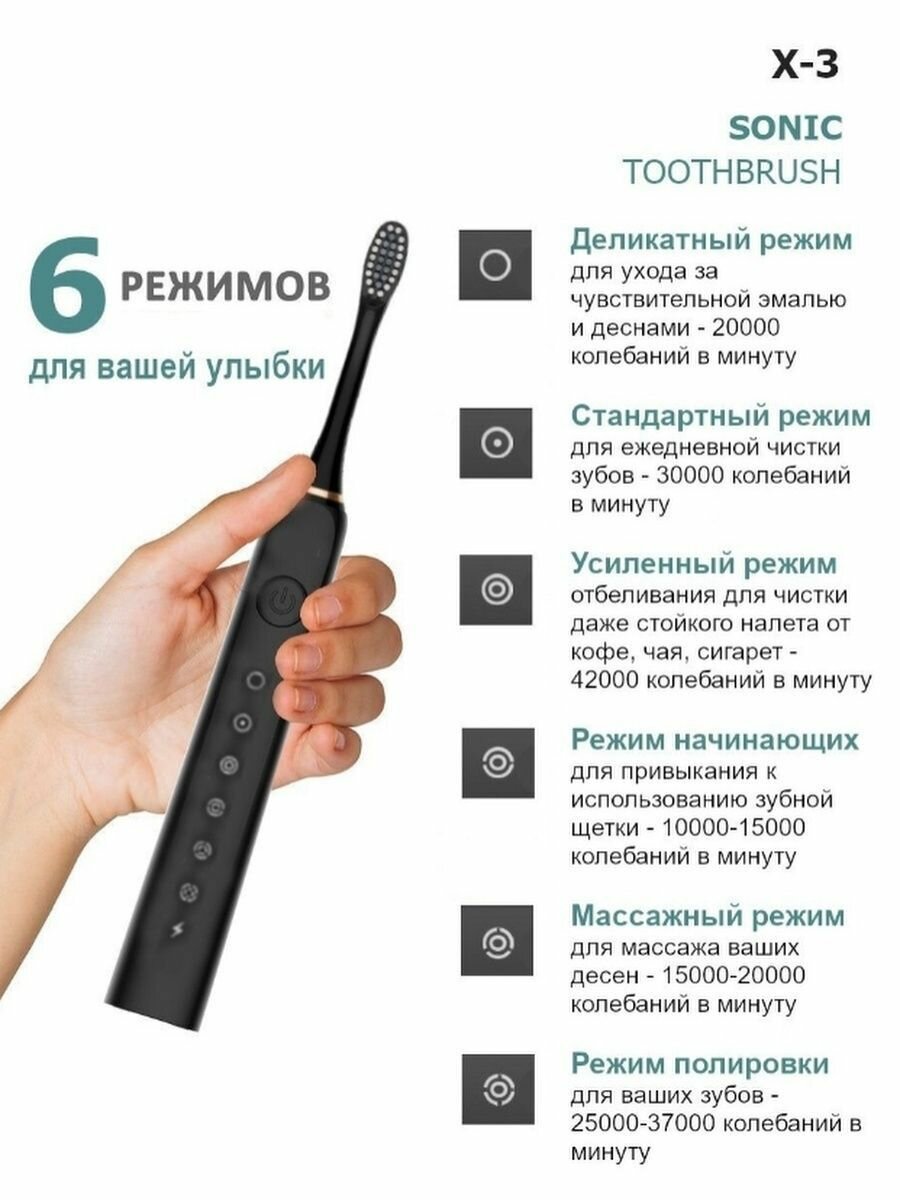 Электрическая зубная щетка Sonic X-3 / средней степени жесткости для взрослых и подростков / Для всех видов зубных паст 6 режимов работы