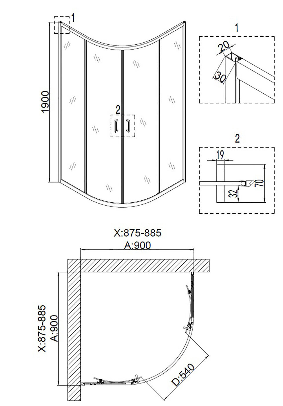 Душевое ограждение NG- 6606-08 (90*90*190) полукруг, двери раздвижные, 1 место