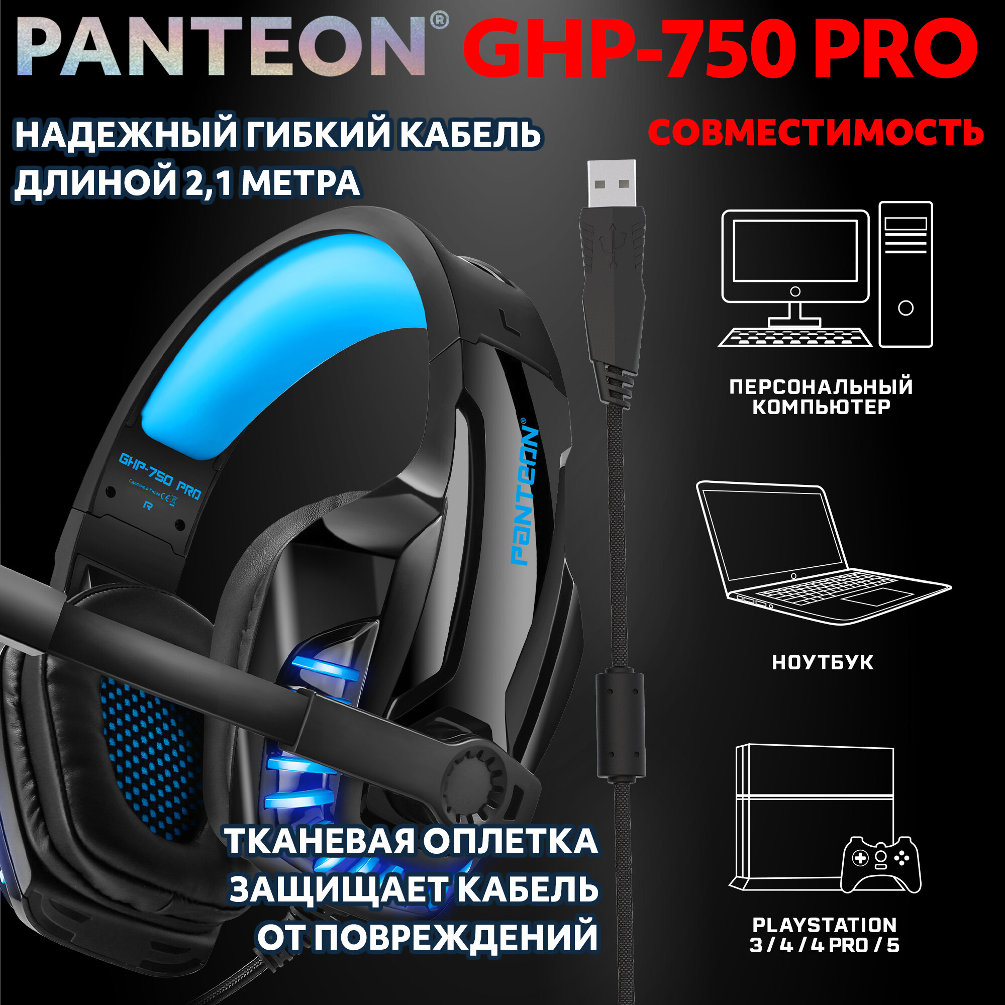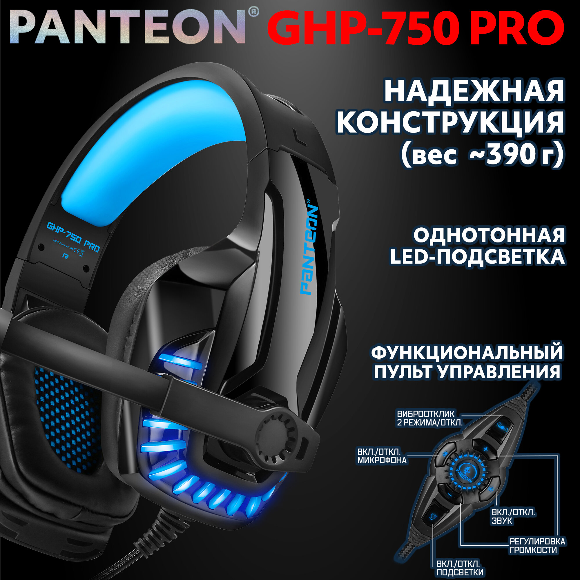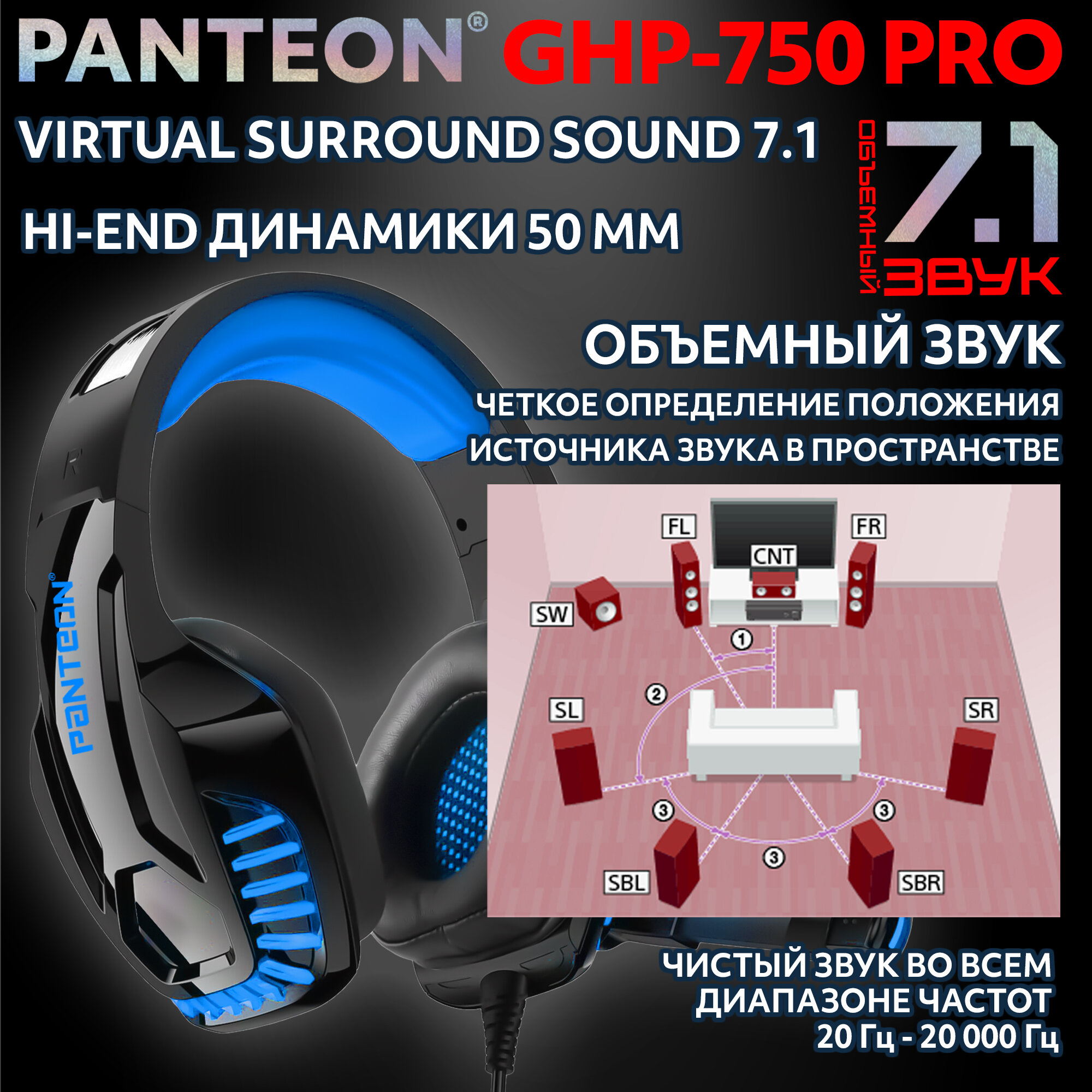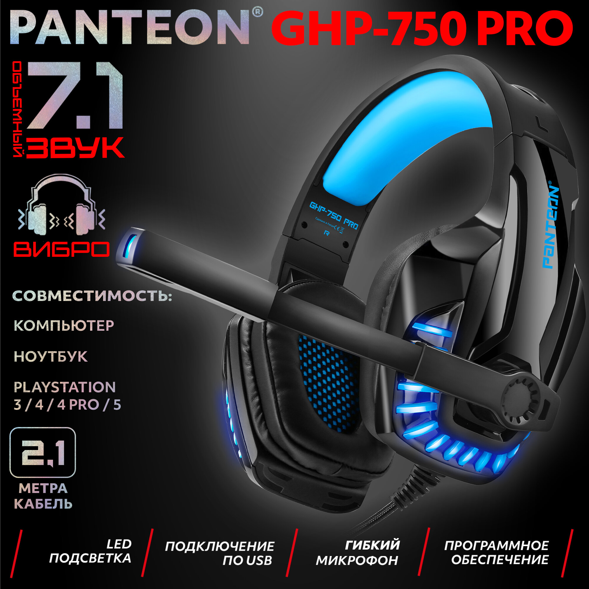 Купить Игровая гарнитура Jet.A Panteon GHP-750 PRO черно-синяя (USB,однотон.LED,звук 7.1, виброотклик)