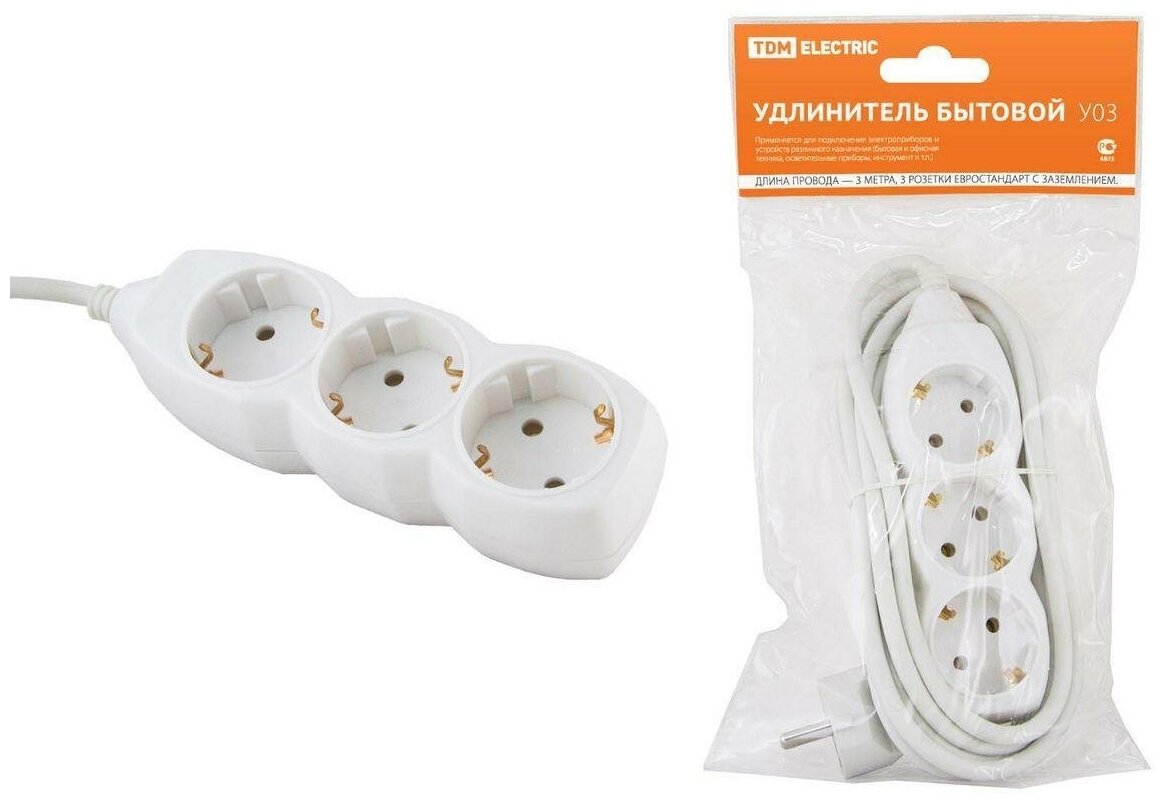 Удлинитель бытовой TDM У03, 3 гнезда, с заземлением, ПВС 3x1, 3м