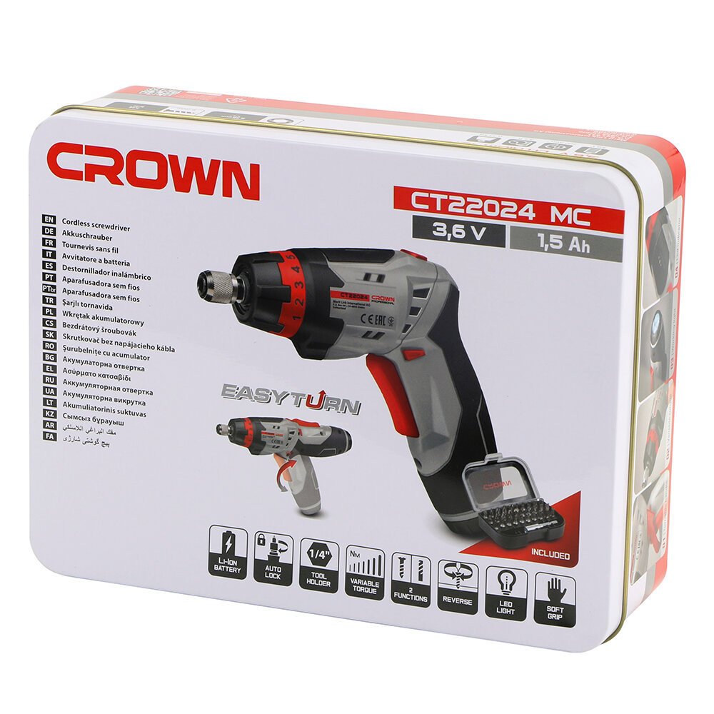 Аккумуляторная отвертка-фонарь CROWN CT22024 MC 3,6В, 1.5Ач, 3,5Hm + 30шт. бит, металл. кейс