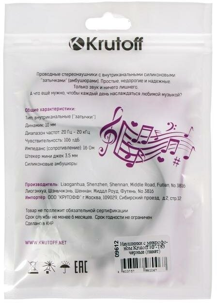 Наушники Krutoff HF-T83, вакуумные, микрофон, 106 дБ, 16 Ом, 1 м, черные Krutoff 5141234 .