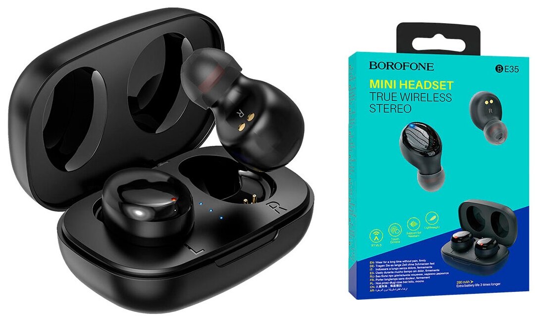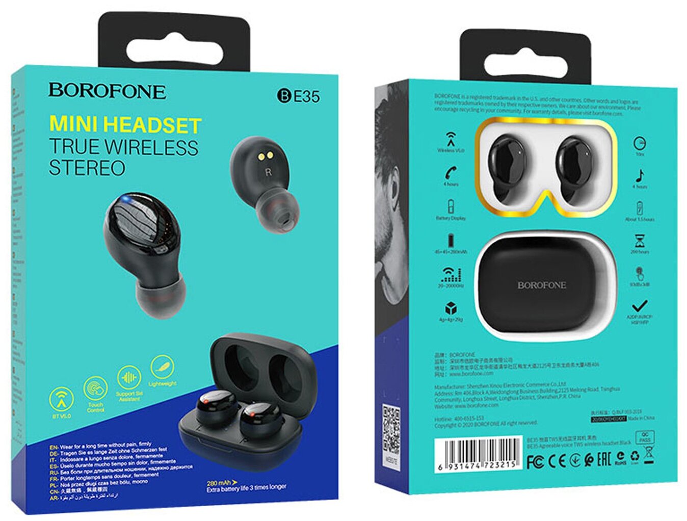 Наушники беспроводные Borofone BE35, вакуумные, TWS, микрофон, BT 5.0, 45/280 мАч, черные