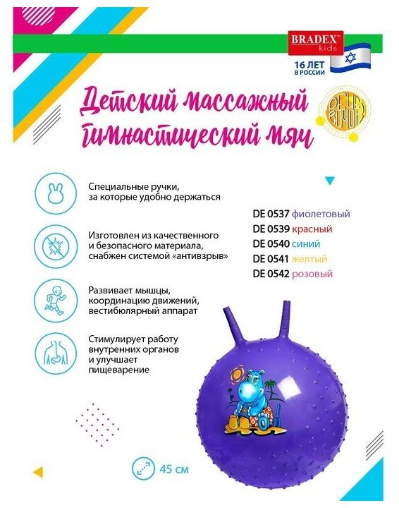 Мяч-попрыгун детский массажный гимнастический 45 см, фиолетовый, Bradex / Прыгун с ручками рожками / Детский мяч для фитнеса / Мячик надувной / Игрушка надувная