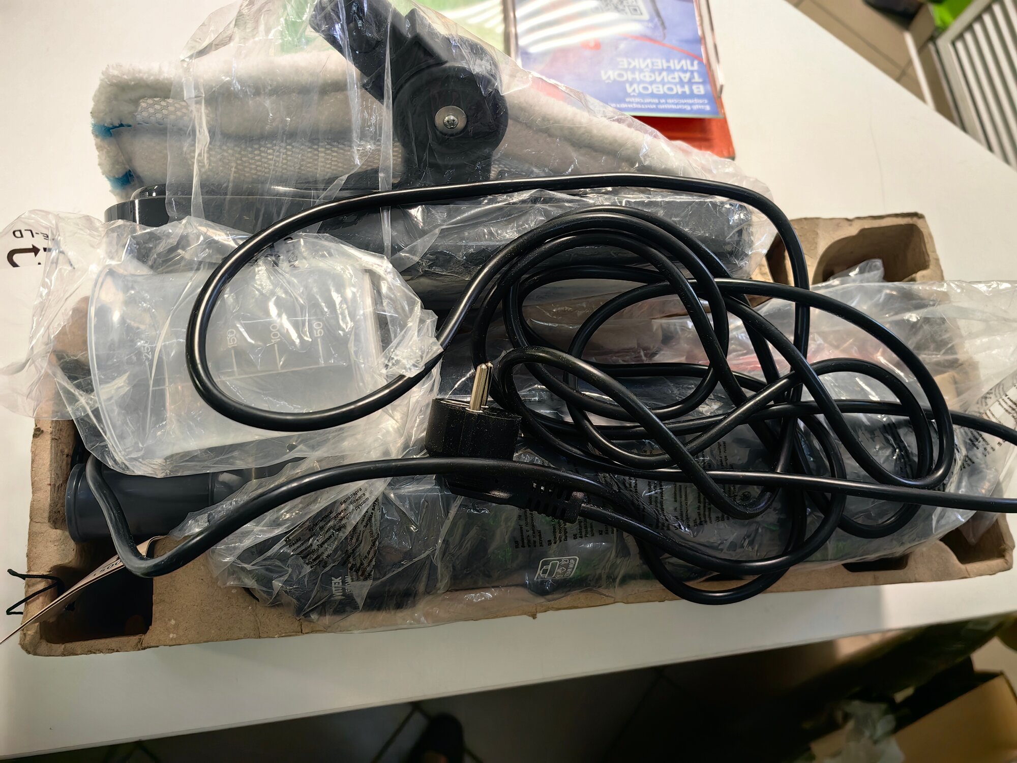 | Минусы: | шнур мешается при уборке, приходится цеплять его за крепление вверху и использовать удлинитель. |