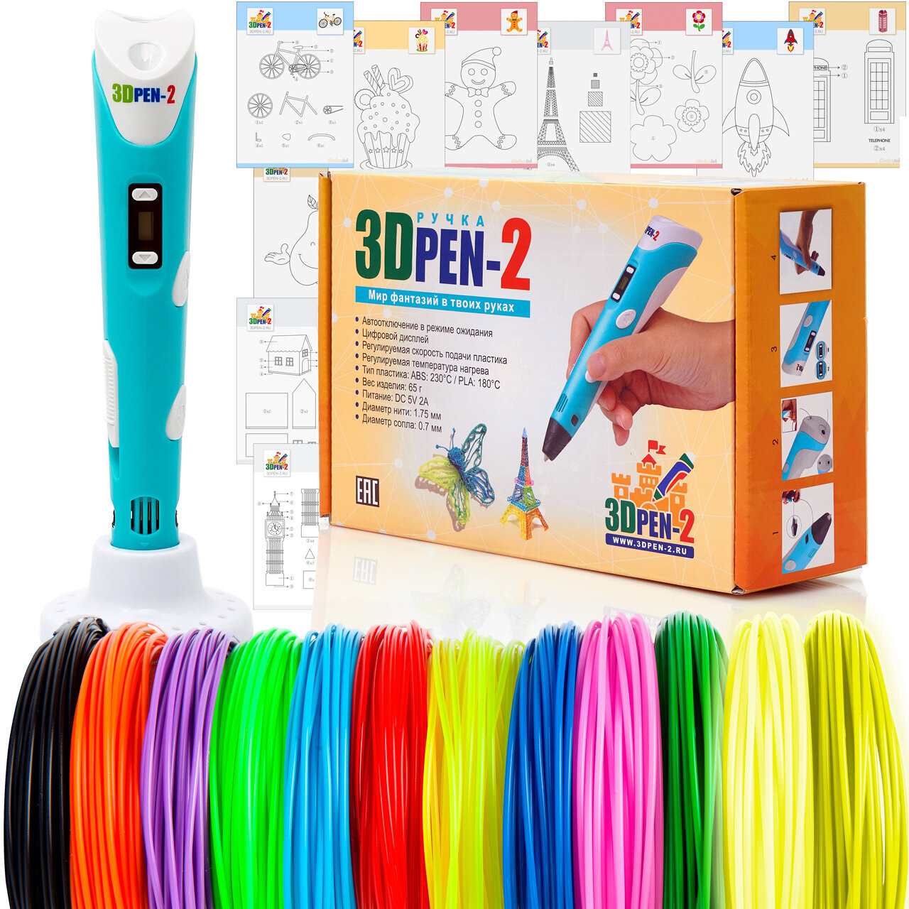 Купить 3D ручка 3DPEN-2 (цвет: голубой) с набором пластика PLA 10 цветов по 10 метров и набором трафаретов для 3D ручек