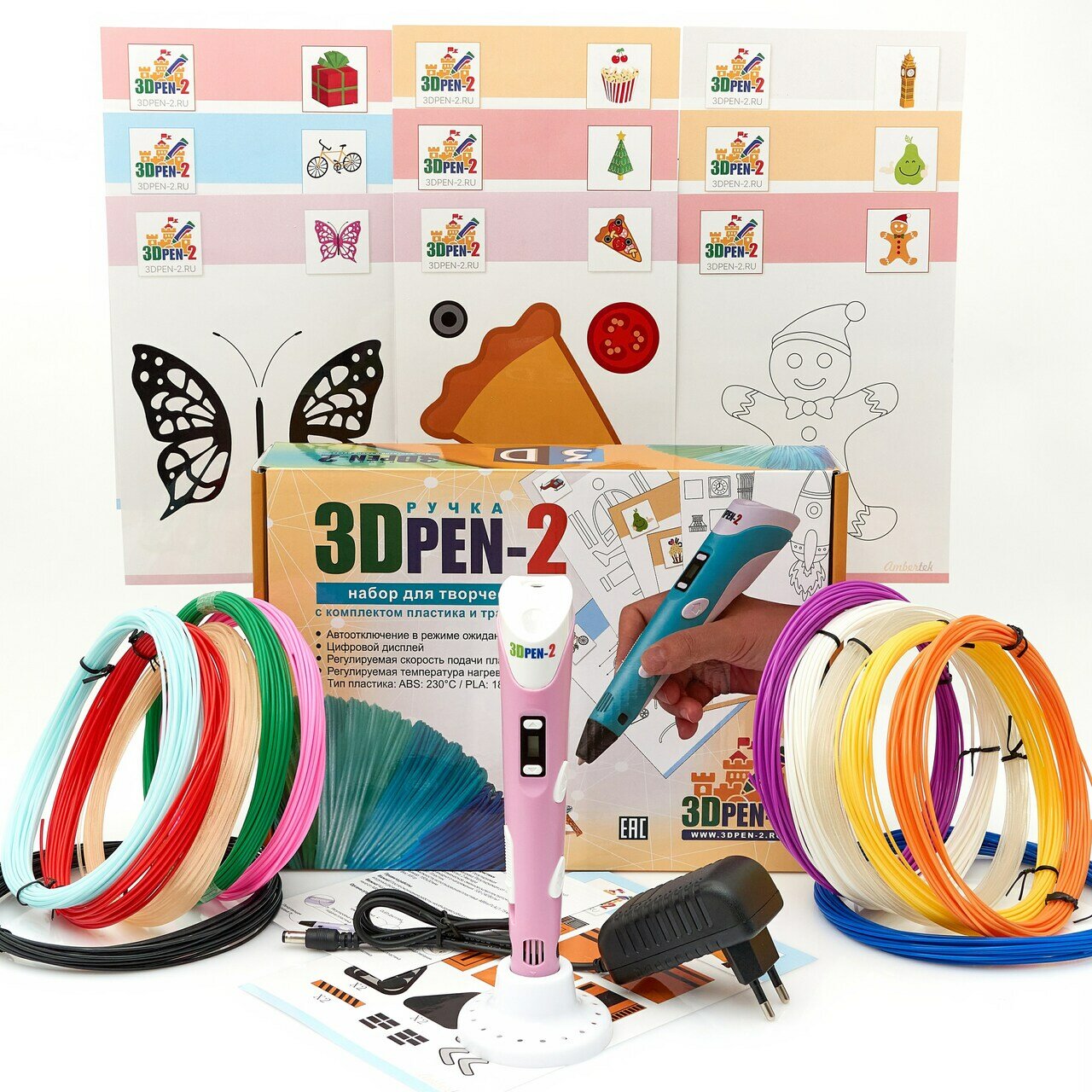 Купить 3D ручка 3DPEN-2 (цвет: розовый) с набором пластика PLA 10 цветов по 10 метров и набором трафаретов для 3D ручек
