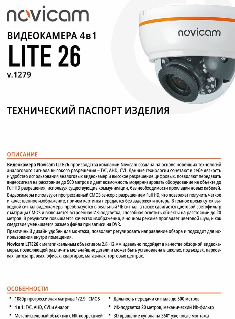 LITE 26 Novicam v.1279 - TVI/AHD/CVI/CVBS видеокамера, матрица 1/2.9" CMOS, 2 Мп 25/30 к/с, объектив 2.8-12 мм, ИК 20м, 0.1 люкс, DC 12В, меню интересное: