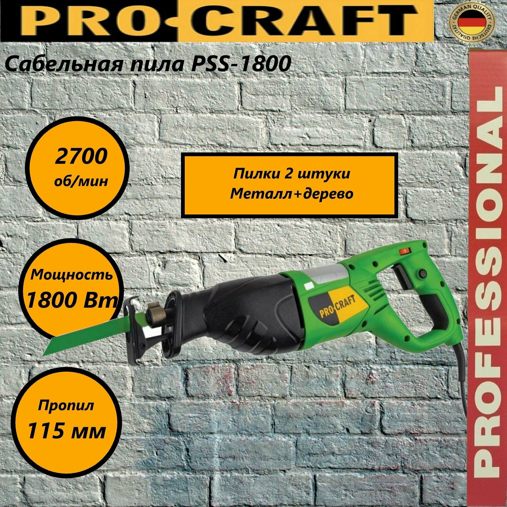 Сабельная пила ProCraft PSS 1800, 2700об/мин, 750Вт, пропил 115мм