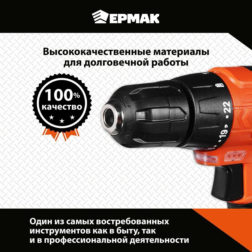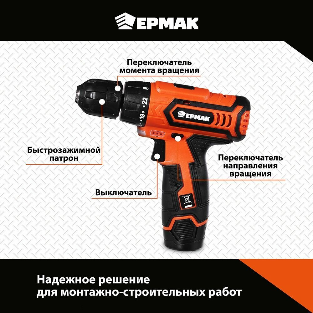 Дрель-шуруповерт аккумуляторная Ермак ДША-12В /1,3Ач/Li-Ion/ 19 Н*м/19+1скор/1 аккум/коробка. интересное: