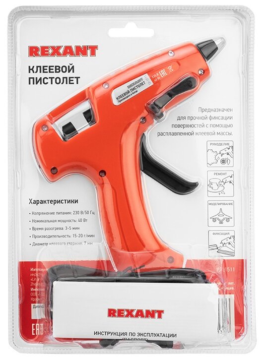 Пистолет клеевой REXANT, 40 Вт, Ø7 мм, «эксперт», блистер Артикул 12-1511