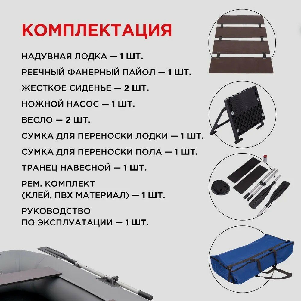 | Состав набора | надувная лодка 1 шт., реечный фанерный пайол 1 шт., жесткое сиденье 2 шт., ножной насос 1 шт., весло 2 шт., сумка-рюкзак для переноски 1 шт., транец навесной 1 шт., ремонтный комплект (клей, ПВХ материал) 1 шт., руководство по эксплуатации 1 шт. |