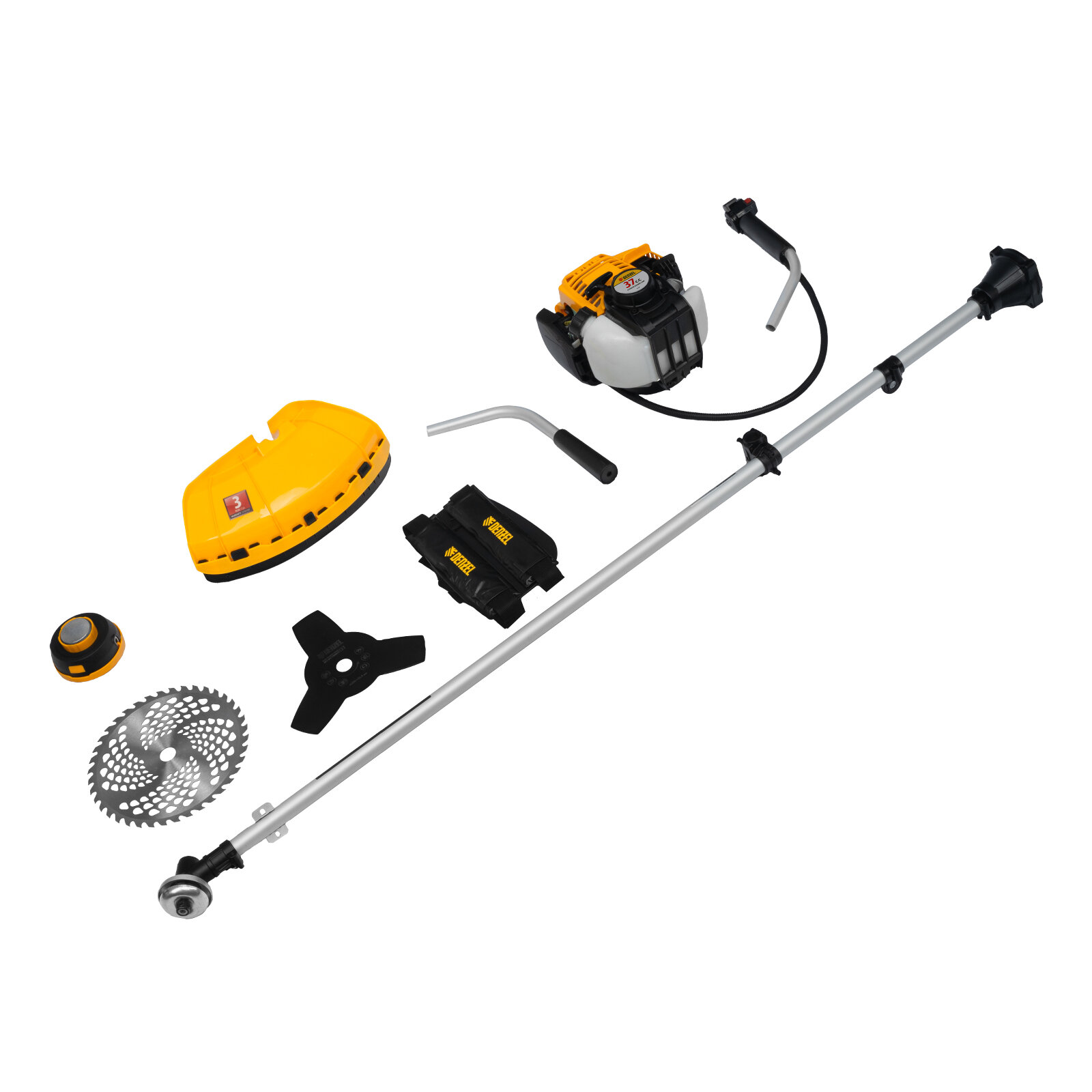 | Подробная комплектация | триммер, катушка, металлический нож, пильный диск, защитный кожух, ремень плечевой, упаковка, руководство по эксплуатации, рукоятка, набор инструментов, ёмкость для смеси |