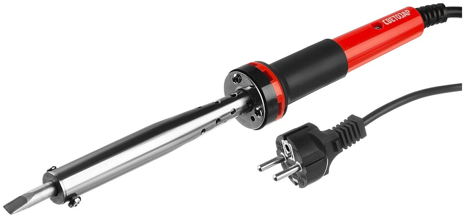 Электропаяльник СВЕТОЗАР "премьер", 2-комп. рукоятка, жало "LONG LIFE", форма клин, 80Вт интересное: