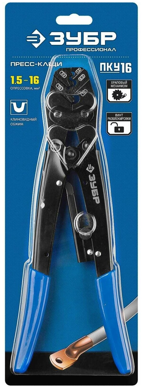 Пресс-клещи ЗУБР Профессионал ПКУ-16, усиленные, для медных наконечников и гильз, 1.5-16 мм.кв